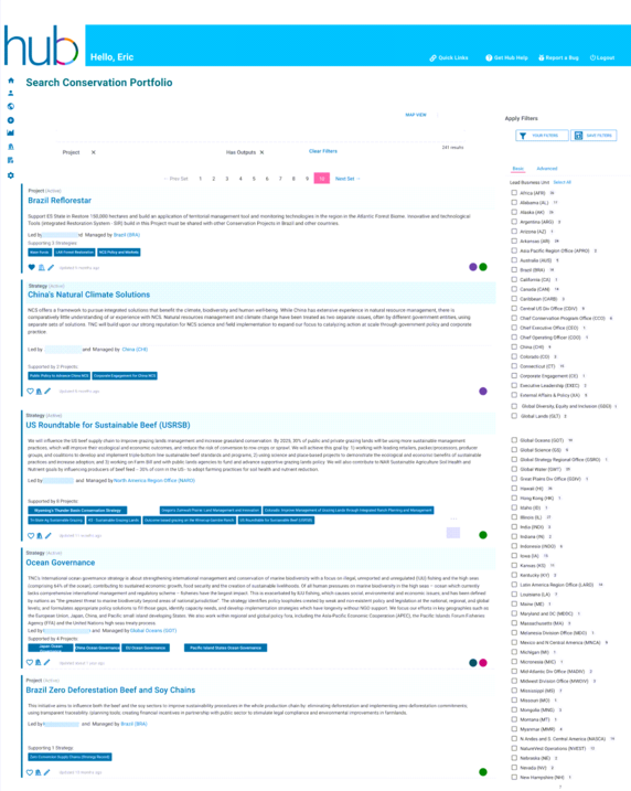We built a zero to launch platform, called the Conservation Hub, that would aggregate conservation data to allow TNC staff to better understand the global impact our conservation work had on our 2030 goals. Key functions of the Hub include: