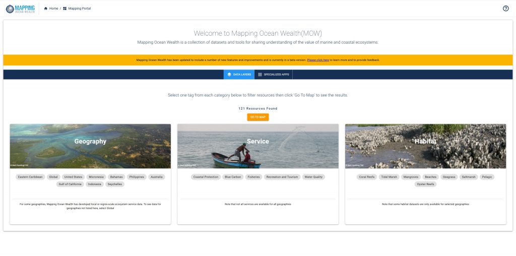 Overview: The Ocean Science team needed a map-based collection of datasets and tools to promote a shared understanding of the value of marine and coastal ecosystems.